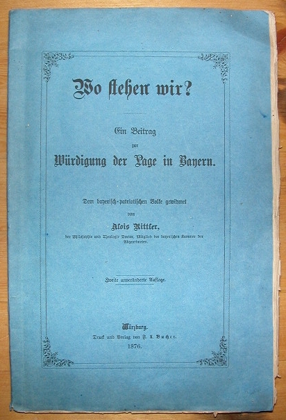 Rittler, Alois: Wo stehen wir. Ein Beitrag zur Würdigung der Lage in Bayern. Dem bayerisch-patriotischen Volke gewidmet. Würzburg, Bucher 1876. 24 x 15,5 cm. VI, 77 Seiten. Bedruckte blaue Original-Broschur. Etwas gebräunt und knittrig, Seitenränder unbeschnitten.