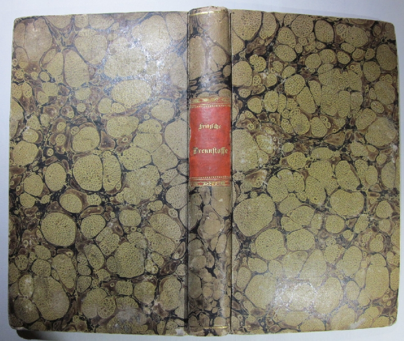 Fritzsche, Carl: Die Brennstoffe und ihre Anwendung, oder: Eigenschaften, Zusammensetzung, Gewinnung und Bereitung der verschiedenen Brennstoffe, nebst Bemerkungen über ihre vortheilhafte Anwendung für matallurgische, technische, haus- und landwirthschaftliche Zwecke. Ein populäres Handbuch für alle die, welche Gebrauch von der Wärme in ihrem Gewerbe oder im Haushalte machen, wie auch für Ofenbaumeister, Maurer, Töpfer, Schwarzblecharbeiter, Klempner und Jeden, der sich mit Anlagen von Feuerungsapparaten befasst. Nach den beßten Hilfsmitteln bearbeitet. Neustadt an der Orla, Johann Karl Gottfried Wagner 1843. 21 x 12,2 cm. VI, 306 Seiten (inkl. 8 Tabellen) und 8 gefaltete lithographierte Tafeln. Marmorierter Pappband der Zeit mit goldenem Rückentitel auf rotem Schildchen. Einband etwas angestaubt und berieben, Rücken ein wenig schiefgelesen. Erste Ausgabe. Engelmann, Bibliotheca mechanico-technologica, Supplement Seite 32.