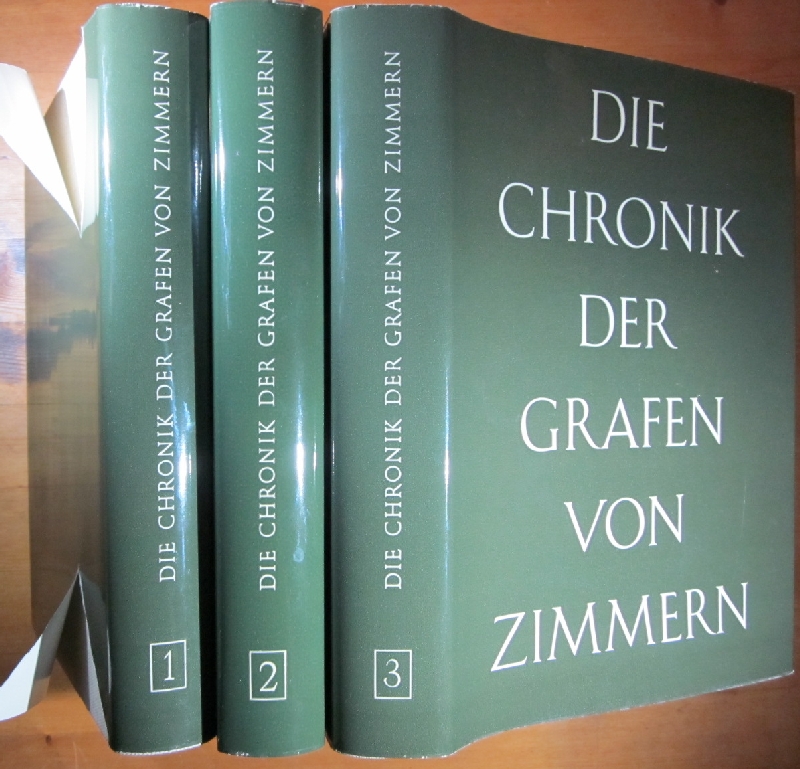 Zimmern.– Decker-Hauff, Hansmartin und Rudolf Seigel (Herausgeber): Die Chronik der Grafen von Zimmern. Handschriften 580 und 581 der Fürstlich Fürstenbergischen Hofbibliothek Donaueschingen. Verschiedene Auflagen. 3 Bände. Sigmaringen, Thorbecke 1972-1973. 23,9 x 17,6 cm. 368; 376; 365 Seiten, mit einigen Abbildungen. Original-Leinen mit Schutzumschlägen. Umschlag ein wenig angestaubt und berieben, Schutzumschlag von Band 1 mit zwei längeren Einrissen auf der hinteren Seite. Sonst außen und innen sehr gut und sauber.