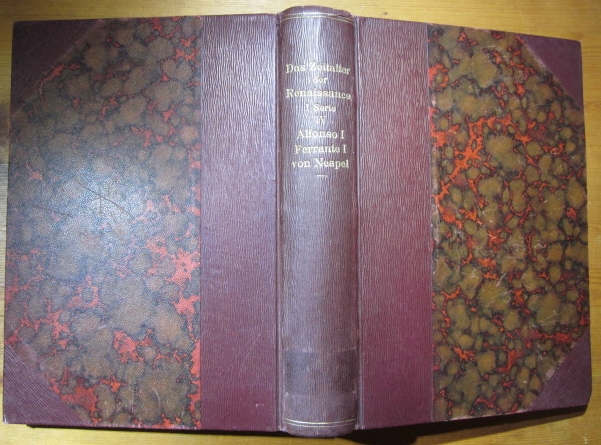 Herzfeld, Marie (Herausgeberin): Alfonso I. / Ferrante I. von Neapel. Schriften von Antonio Beccadelli, Tristano Caracciolo, Camillo Porzio. Übersetzt und eingeleitet von Herman Hefele. Jena, Eugen Diederichs 1912. 21,5 x 15,5 cm. LXV, 321 Seiten und einige Tafeln. Halbleinen der Zeit mit goldenem Rückentitel. (Das_Zeitalter der Renaissance. Ausgewählte Quellen zur Geschichte der italienischen Kultur. 1. Serie Band 4).