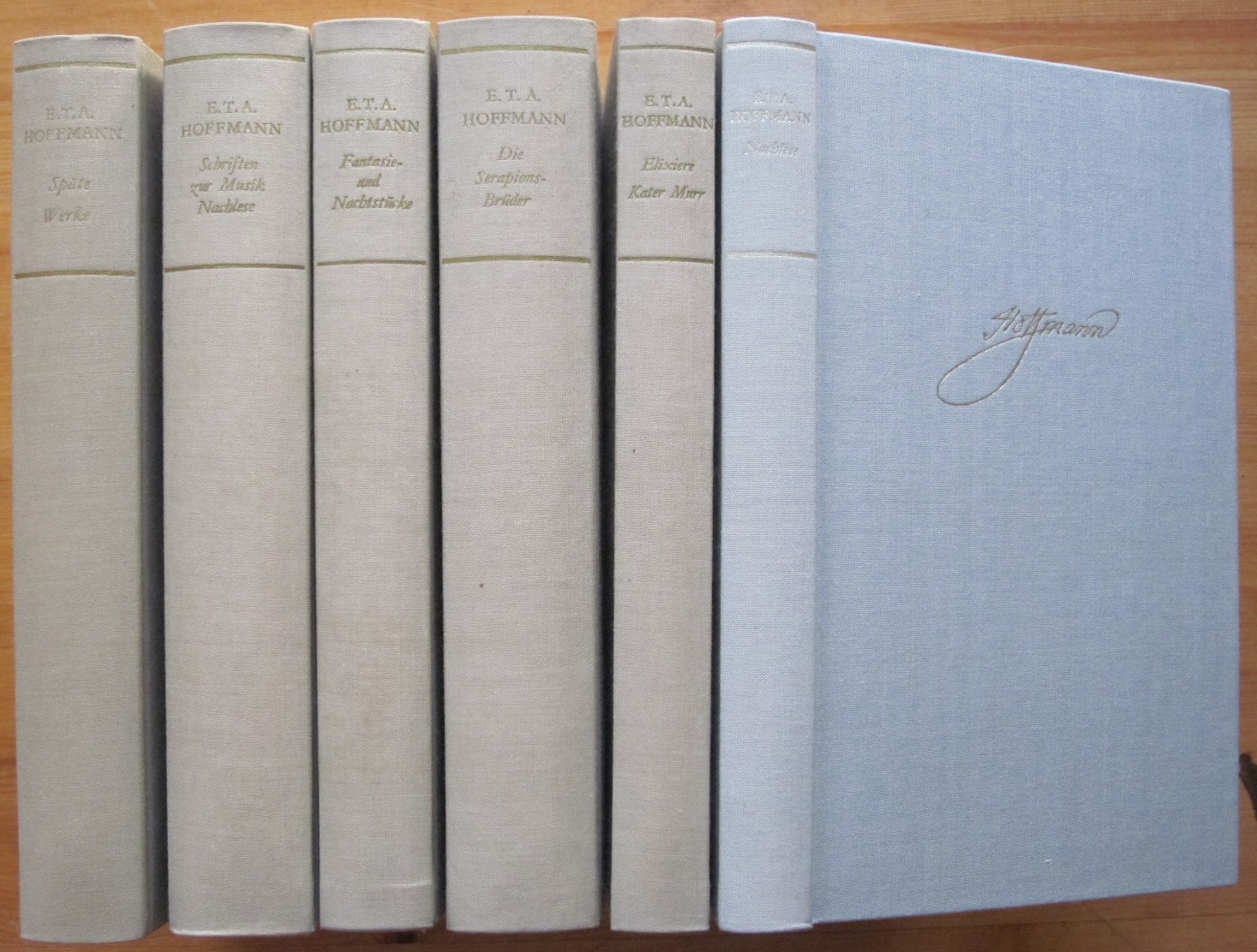 Hoffmann, E. T. A.: Werke. (1) Elexiere des Teufels. Lebens-Ansichten des Katers Murr. (2) Die Serapions-Brüder. (3) Fantasie- und Nachtstücke. (4) Späte Werke. (5) Schriften zur Musik; Nachlese. (6) Nachlese. Dichtungen, Schriften, Aufzeichnungen und Fragmente. Nach dem Text der Erstdrucke, unter Hinzuziehung der Ausgaben von Carl Georg von Maassen, Georg Ellinger und Hans von Müller, herausgegeben und mit Nachworten versehen von Walter Müller-Seidel, mit Anmerkungen von Wolfgang Kron, Friedrich Schnapp und Wulf Segebrecht. Mit den Illustrationen von Theodor Hosemann zur ersten Gesamtausgabe von 1844/45. 5 Bände. Darmstad und München, Wissenschaftliche Buchgesellschaft (1-5) und Winkler (6) 1962-1981. 19,4 x 12 cm. 731; 1154; 822; 943; 1060; 534 Seiten (Dünndruckausgabe). Original-Leinen. Bände 1 bis 5: Einbände ein klein wenig gebräunt und Rücken ein wenig verblasst. Besitzeintrag jeweils auf Vorsatz.