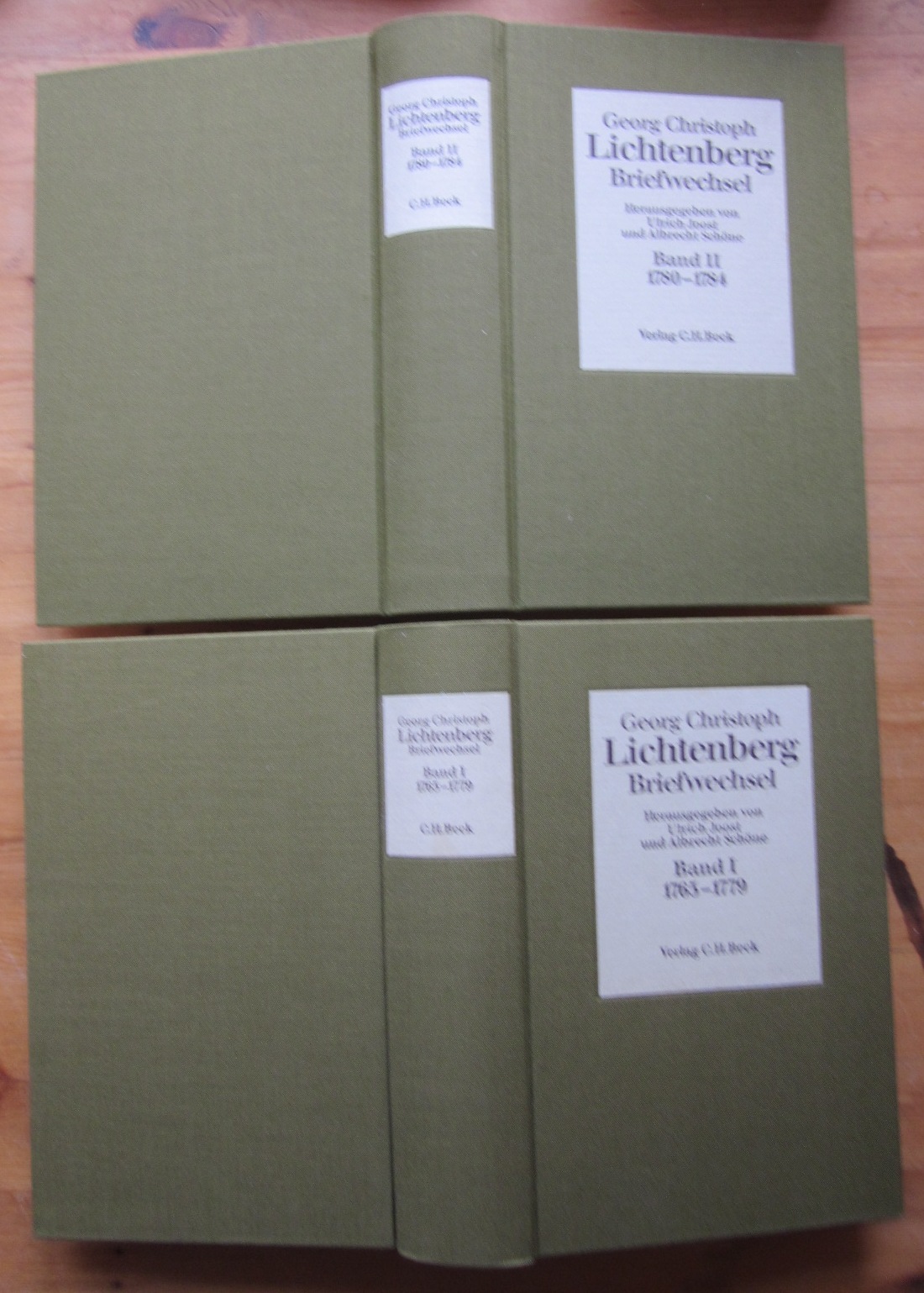 Lichtenberg, Georg Christoph: Briefwechsel. Herausgegeben von Ulrich Joost und Albrecht Schöne. Hier nur Bände 1 (1765-1779) und 2 (1780-1784) von 4. 2 Bände. München, Beck 1983-1985. 22,6 x 14,6 cm. XLI, 1077; XI, 1018 Seiten. Original-Leinen mit Original-Cellophanumschlägen und Original-Kartonschubern.