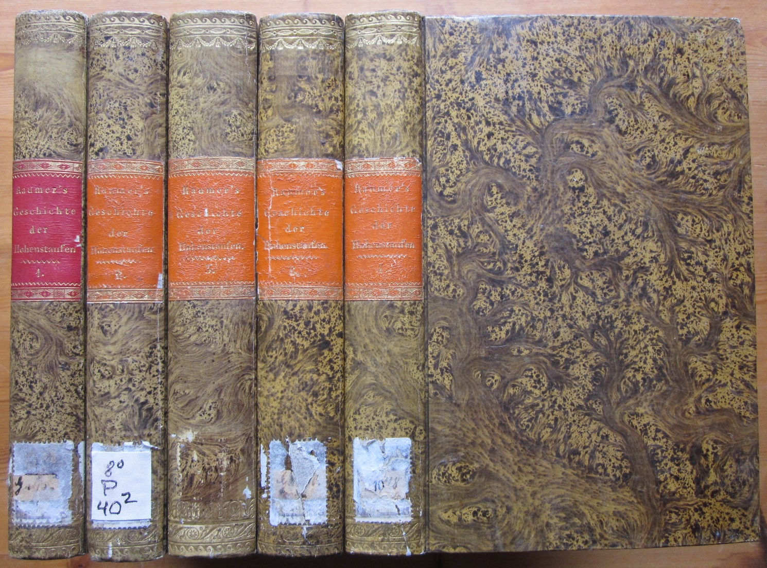 Raumer, Freidrich von: Geschichte der Hohenstaufen und ihrer Zeit. Hier nur die Bände 1 bis 4 und 6 (Band 5 fehlt). 5 Bände (von 6). Reutlingen, Enßlin 1828-1829. 21 x 13,5 cm. (1): XVIII, 509 Seiten, 1 Kupfer, 2 Pläne (auf einer gefalteten Tafel) und eine gefaltete grenzkolorierte Karte. (2): X, 517 Seiten und 1 Kupfer. (3): X, 652 Seiten, 2 Kupfer und eine mehrfach gefaltete grenzkolorierte Karte. (4): VIII, 591 Seiten, 5 Kupfer und 1 Karte. (6): XVI, 559 Seiten. Also (abgesehen vom fehlenden Band) komplett mit allen Karten und Kupfern sowie einigen gefalteten Stammtafeln. Marmorierte Pappbände der Zeit mit goldenen Rückentiteln auf roten Schildchen. kanten ein klein wenig berieben, Bibliothekssignaturen auf den Rücken. Stempel auf den Titeln.