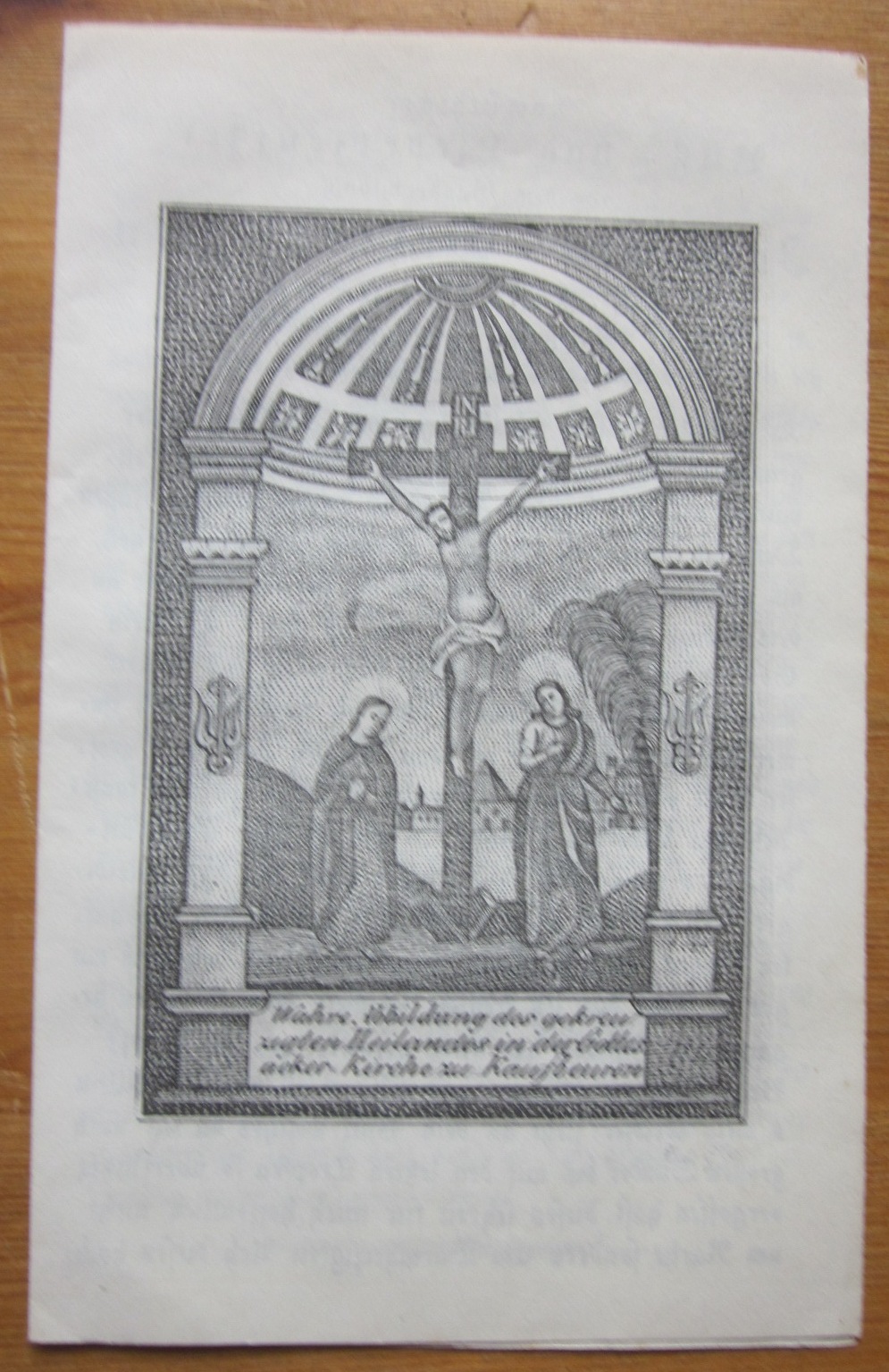Kaufbeuren: Wahre Abbildung des gekreuzigten Heilandes in der Gottesacker-Kirche zu Kaufbeuren. Lithographie (Bildgröße 10 x 6,5 cm). Lithograph und Drucker/Verleger nicht lesbar. Innen mit zweiseitigem Gebetstext: „Anmuthiger Buß– und Liebesseufzer“. Kaufbeuren ohne Jahr. 14,5 x 9 cm. 1 gefaltetes Blatt.