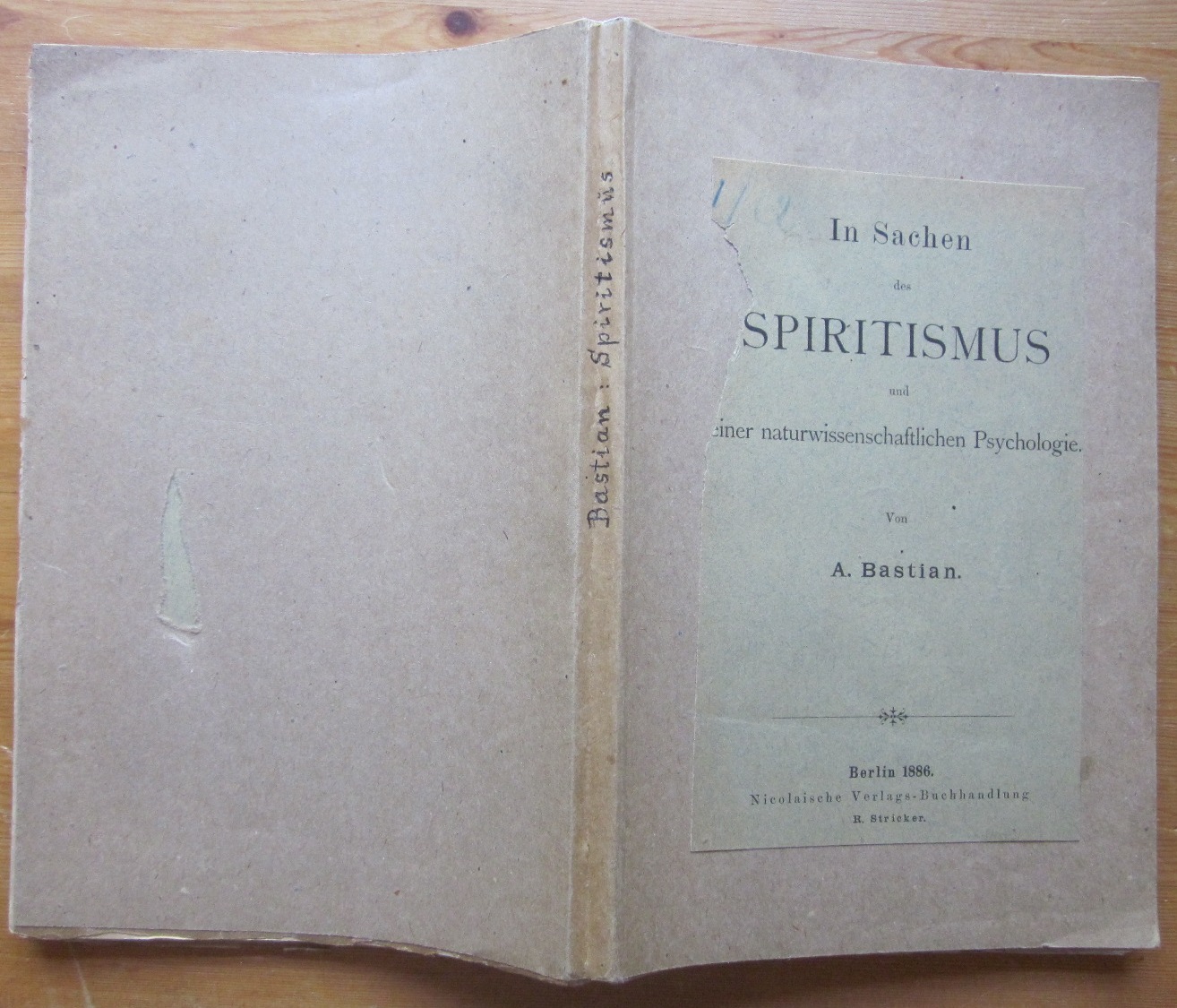 Bastian, A.: In Sachen des Spiritismus und einer naturwissenschaftlichen Psychologie. Berlin, Nicolai 1886. 21,8 x 14,4 cm. XX, 216 Seiten, 1 Bl. Schlichte spätere Broschur mit handschriftlichem Rückentitel. Teil des Original-Vorderdeckels aufgezogen, hinterer Deckel der Original-Broschur mit eingebunden. Rücken mit Leseknick, hinterer Deckel mit Loch. Stempel auf Titel.