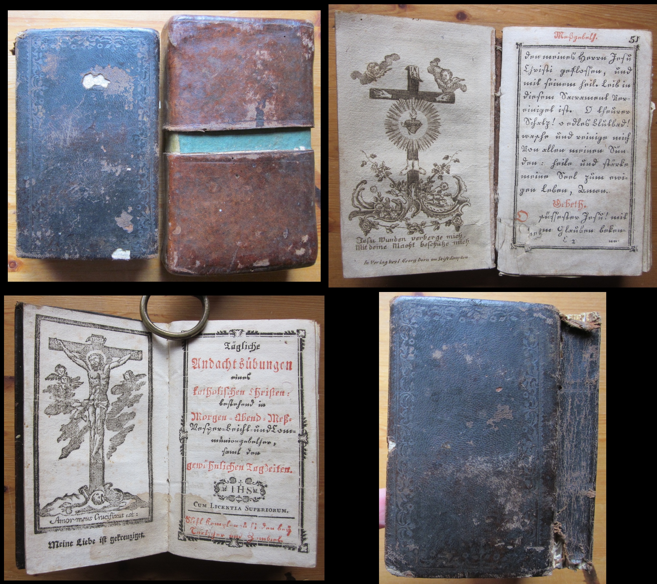 Gebetbuch: Tägliche Andachtsübungen eines katholischen Christen: bestehend in Morgen- Abend- Meß– Vesper- Beicht- und Communiongebether, samt den gewöhnlichen Tagzeiten. Kempten, Türtscher und Zumbiel ohne Jahr (1781). 13,5 x 8,4 cm. 285, (3) Seiten (inkl. Holzschnitt-Frontispiz) und 12 Kupfertafeln. Leder der Zeit in Lederfutteral. Futteral etwas berieben. Einband stark berieben und mit Wurmspuren, Rücken mit Fehlstellen. Bindung stark gelockert. ein Blatt lose. Seiten 25 bis 46 mit kleinem Loch bzw. Einriss, teils miz minimalem Textverlust. 4 Blätter mit etwas größerem Loch bzw. Fehlstelle unten, mit etwas Textverlust. Teils etwas gebräunt, stockfleckig und wasserrandig. Druck in rot und schwarz, in deutscher Schreibschrift gesetzt. Die Kupferstiche aus dem Verlag von Georg Dorn in Kempten.