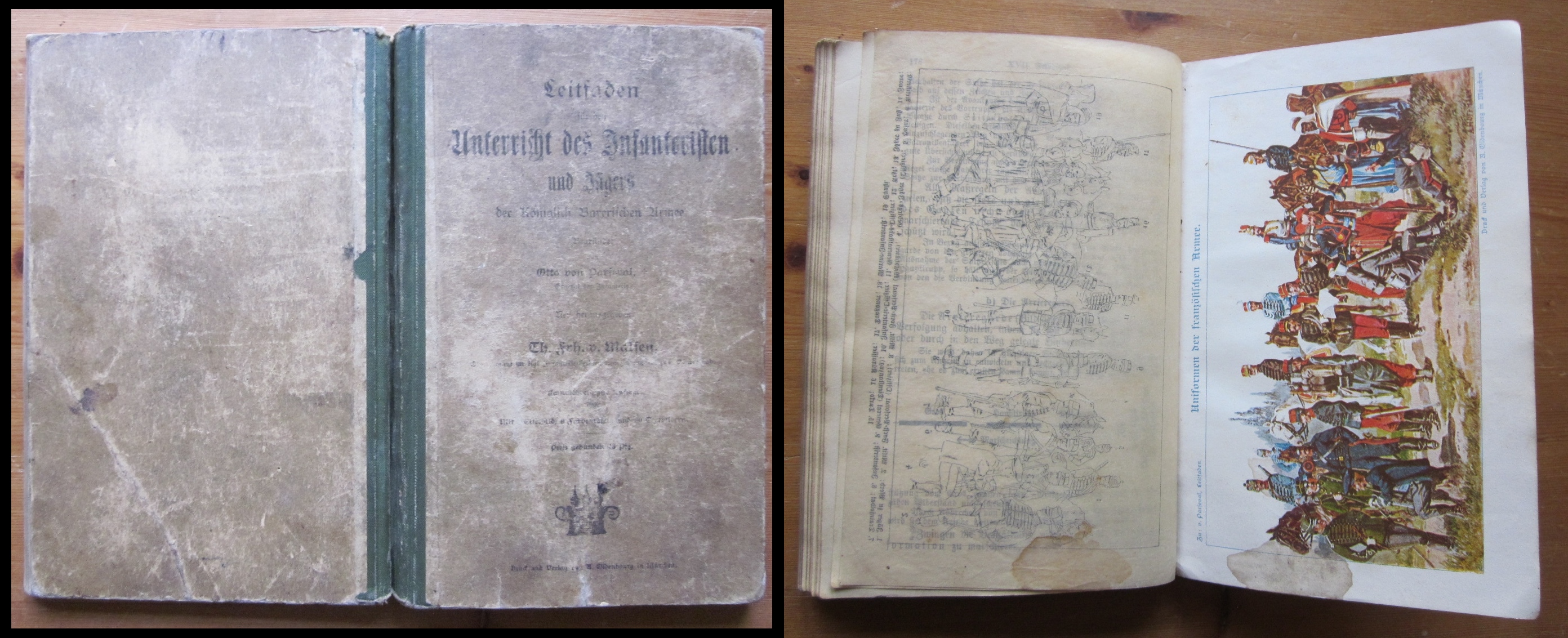 Parseval, Otto von (Begründer): Leitfaden für den Unterricht des Infanteristen und Jägers der Königlich Bayerischen Armee. Neu herausgegeben von Th. Frh. v. Malsen. 38. Auflage. München, Oldenbourg 1902. 18,5 x 12 cm. XIX, 224, 2 Seiten mit 1 Titelbild, 60 Textbildern und 9 Farbtafeln. Original-Halbleinen. Einband stark angestaubt, gebräunt und berieben. Exlibris auf Vorsatz (Infanterist Albrecht 20. Inf.-Reg. 7. Komp.). Innen durchgehend gebräunt und fingerfleckig. Eine Frabtafel und zugehöriges Seidenhemdchen mit Wasserfleck. Heftklammern angerostet.