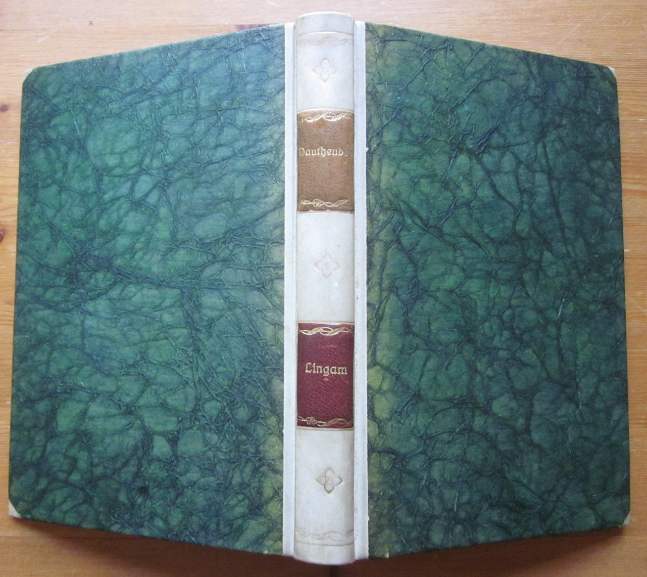 Dauthendey, Max: Lingam. Zwölf asiatische Novellen. 8.-10. Tausend. München, Albert Langen 1920. 18,5 x 13 cm. 200 Seiten. Halbpergament der Zeit mit goldenem Rückentitel auf zwei Lederschildchen und ein wenig Rückenvergoldung. Besitzeintrag auf Vorsatz.