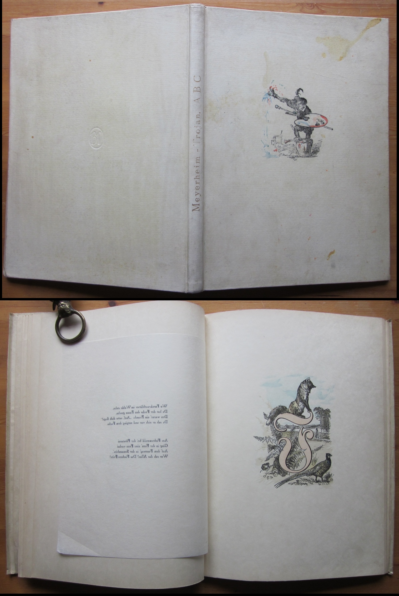 Meyerheim, Paul: ABC. Verse von Johannes Trojan. Berlin, Brandus 1916. 32 x 23,5 cm. 28 (außer bei Bl. 1) einseitig bedruckte Bl. mit kolorierter Titelillustration und Vignette (diese beiden mit der kolorierten Einbandvignette identisch) und 25 handkolorierte Illustrationen (Holzschnitte nach den Federzeichnungen von Meyerheim) und 25 Bl. (transparentes Japanpapier) mit den Texten. Original-Pergament mit spanischen Kanten. Einband etwas fleckig und ein klein wenig angestaubt und berieben. Nummer 286 von 430 Exemplaren, gedruckt auf Kaiserlich Japan von Gebr. Feyl, von H. Froehlich mit der hand koloriert und bei Wübben & Co, Berlin, in Pergament gebunden.