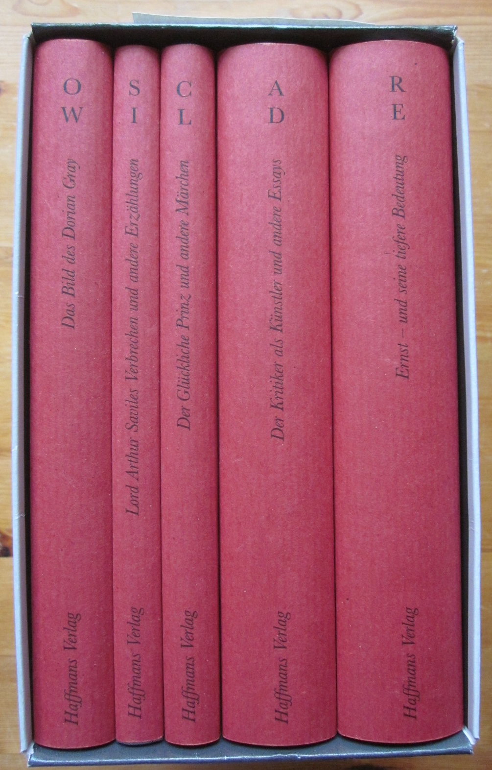 Wilde, Oscar: Werke in fünf Bänden. Zürcher Ausgabe. Vollständig neu Übersetzt von Hans Wolf, Eike Schönfeld, Susanne Luber, Georg Deggerich und Bernd Eilert. Mit Beiheft von Stephen Fry. 5 Bände. Zürich, Haffmans 1999. 18,5 x 11,5 cm. 351; 150; 207; 543; 631; 351; 31 Seiten. Original-Leinen mit Schutzumschlägen in Original-Kartonschuber. Exlibris jeweils auf Vorsatz, sonst sehr gut.