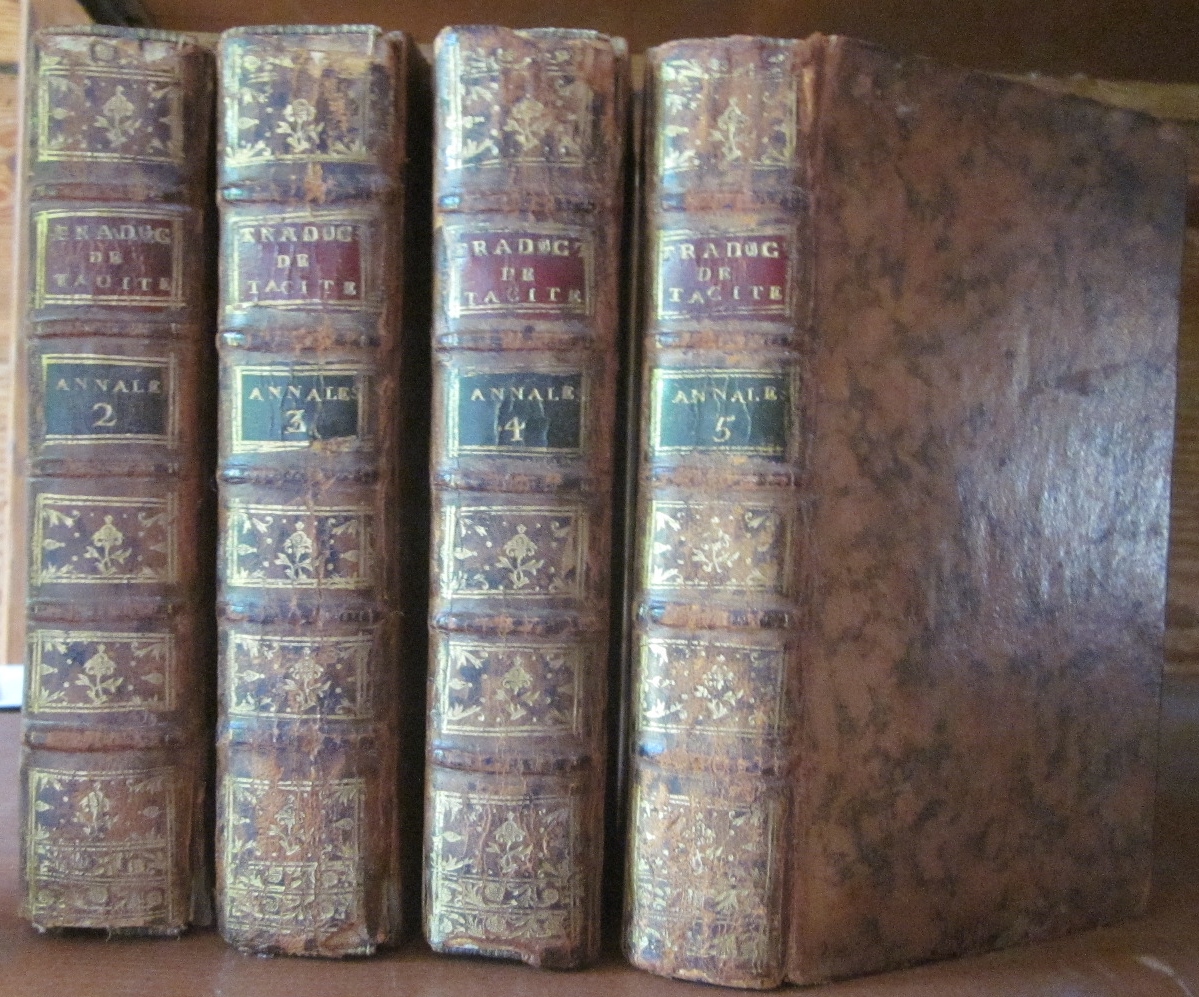 Tacitus, Cornelius: Traduction complettte de Tacite. Hier NUR die Bände 2 bis 5 der Reihe: Annales de Tacite, en Latin et en François; Regnes de Tibere et de Caius tome premier, tome second / Regnes de Claude et de Neron, tome premier, tome second. Par J. H. Dotteville, de l’Oratoire. Bände 4 und 5 in zweiter Auflage. 4 Bände. Paris, Moutard 1779-1786. 16,5 x 10 cm. VI, 567, (1); 544; VI, 567, (1); 485 Seiten. Leder der Zeit mit goldenen Rückentiteln auf roten und grünen Schildchen, reicher mit Rückenvergoldung, Rotschnitten und marmorierten Vorsätzen. Einbände berieben, Rückenvergoldung teils abgeriben, Kapitale stark abgegriffen, Außengelenke etwas porös und teils angeplatzt (Bindung und Einbände fest). Innen gut und sauber.