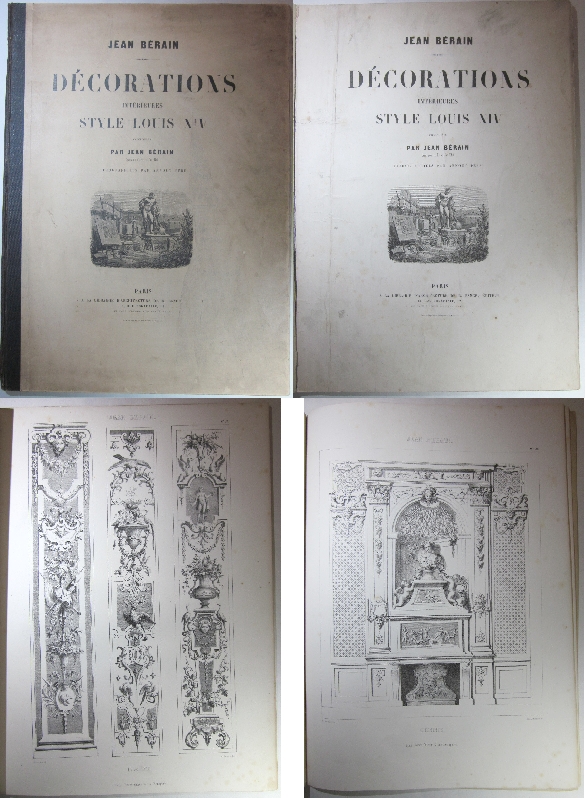 Bérain, Jean: Décorations intérieurs Style Louis XIV composées par Jean Bérain, dessinateur du Roi en l’an 1650. Lithographiées par Arnout Pére. Paris, B. Bance (1849). 43 x 31 cm. Titel mit gestochener Vignette und 30 lithographierte Tafeln. Original-Karton. Einband stark beschmutzt und fleckig, Rücken oben und unten und teils an den Gelenken etwas eingerissen. Titelblatt schmutz- und stockfleckig, die Tafeln teils gering, teils stark stockfleckig. Ornamentale Vorlagenwerke des 19. Jahrhunderts, Bestandskatalog der Kunstbibliothek Berlin, Nr. 77 (Ausgabe von 1864 in anderem Verlag).